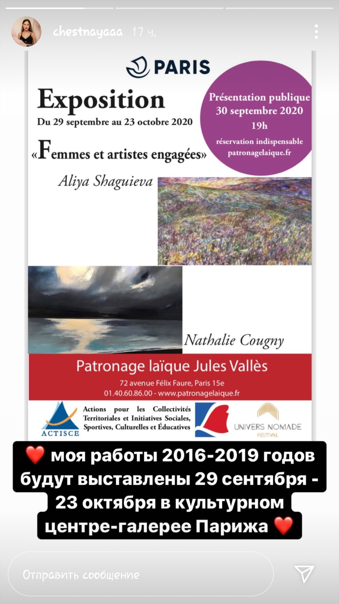 По словам Алии Шагиевой, работы 2016-2019 годов будут выставлены с 29 сентября по 23 октября в культурном центре-галерее столицы Франции.
