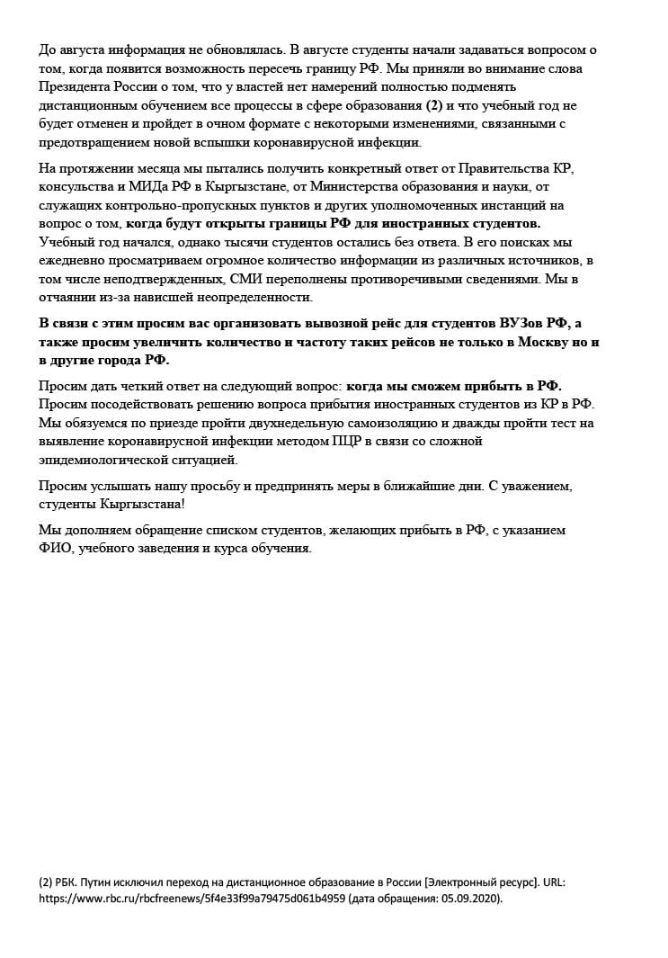 «На протяжении месяца мы пытались получить ответ от правительства, консульства и МИД РФ в Кыргызстане, Министерства образования и науки, служащих контрольно-пропускных пунктов и других уполномоченных органов на вопрос о том, когда будут открыты границы России для иностранных студентов. Учебный год начался, однако тысячи студентов остались без ответа», — говорится в письме.
