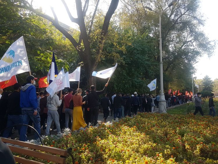 Здесь на акцию протеста вышли партии «Республика», «Бир Бол», «Замандаш» и «Ата Мекен». Они не признают итоги выборов-2020 и требуют их отмены.