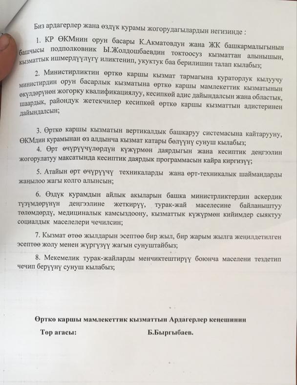 «Посмотрите на нашу технику. Мы едем на наших машинах со скоростью 30 километров в час. Если горит в селе Чон-Арык, то из города туда без поломок не доберешься. Моторы начинают кипеть, выходить из строя. То же можно сказать о форменной одежде и пожарных рукавах, последние рвутся после второго применения. Сегодня радиус выезда наших подразделений — 45 километров, но что мы можем сделать на такой технике?» — заявил бывший начальник противопожарной службы Первомайского района столицы К. Дюшембиев.Пожарные выразили недоверие и потребовали снять с должности заместителя министра ЧС Калыса Акматова.