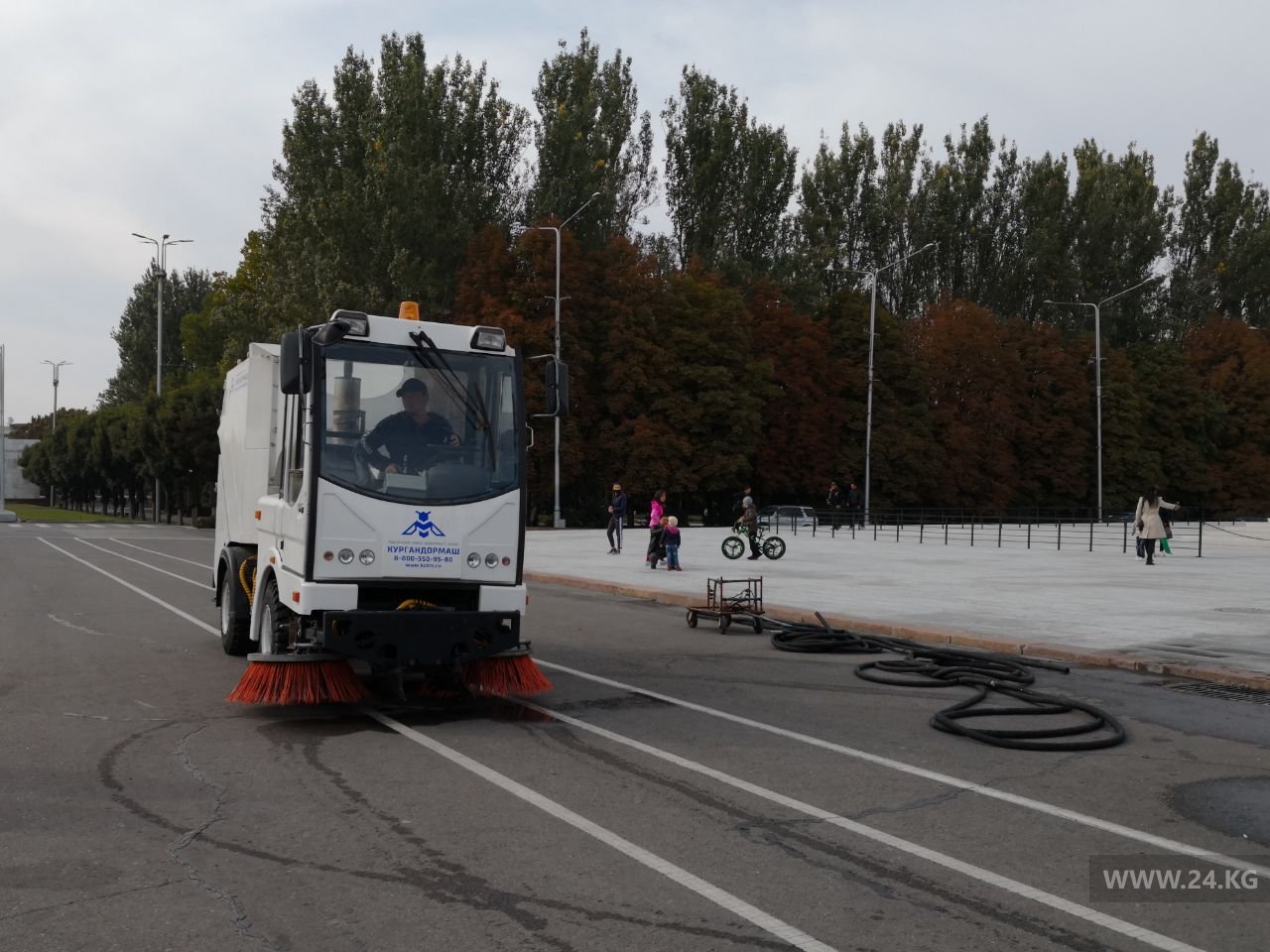 Сотрудники муниципального предприятия «Тазалык» отмывают центральную площадь Ала-Тоо после многочисленных митингов.