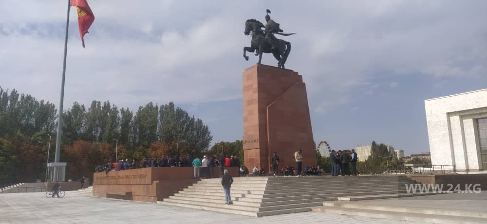 На площади Ала-Тоо митингующих еще нет. У памятника Манасу собралось около 50 дружинников.