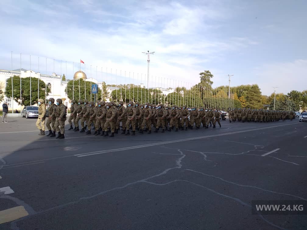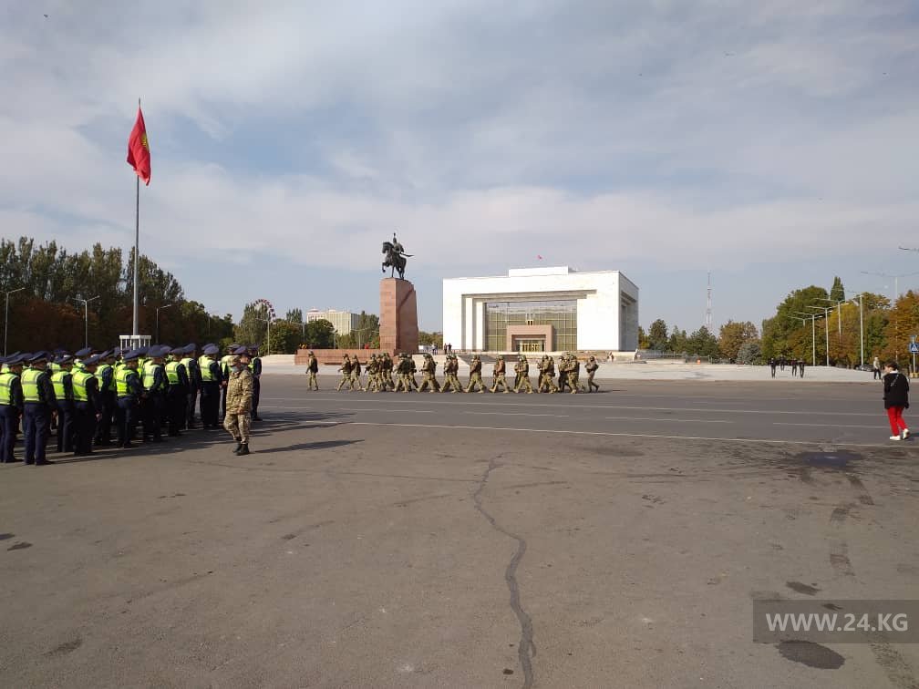 На площадь Ала-Тоо прибывают сотрудники силовых структур. В 16.00 здесь состоится гарнизонный развод.