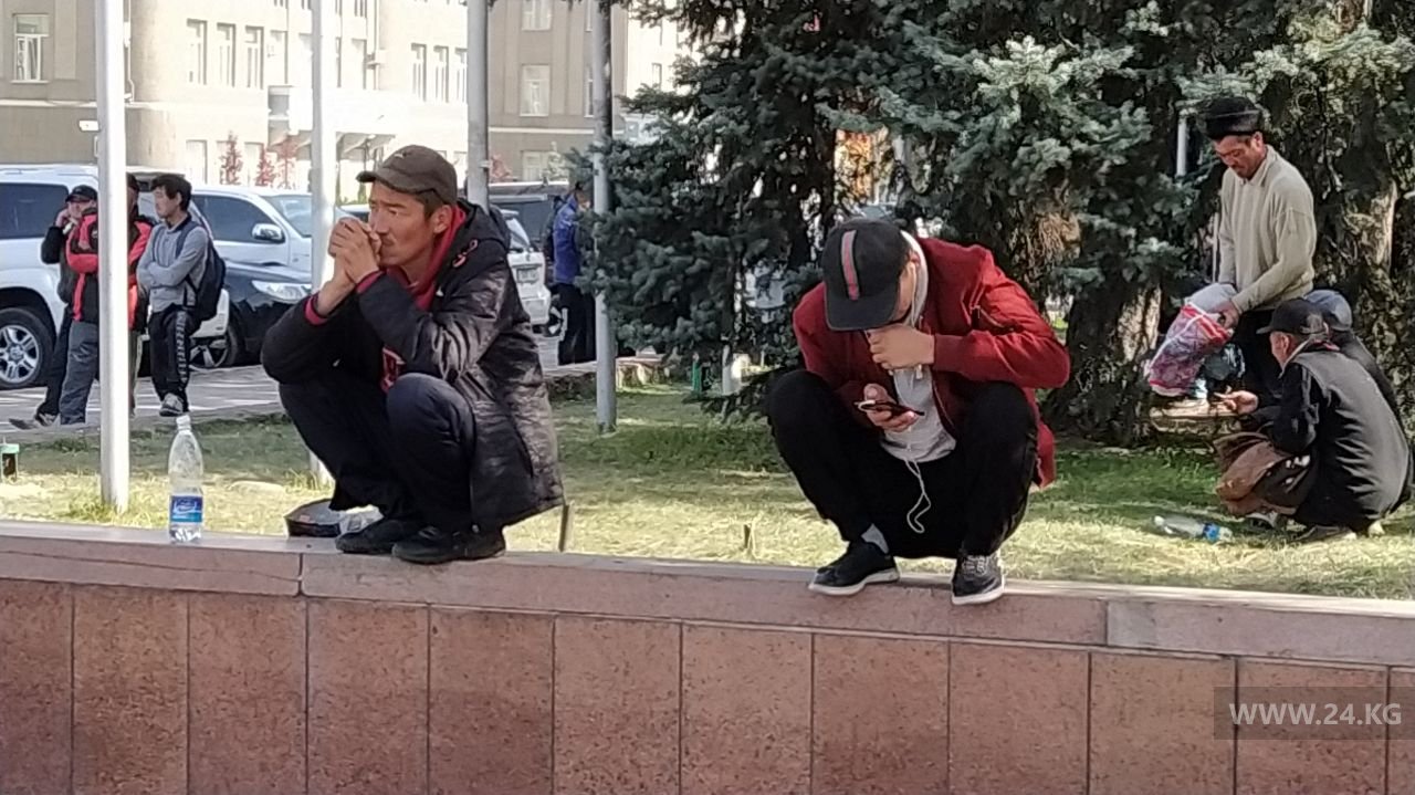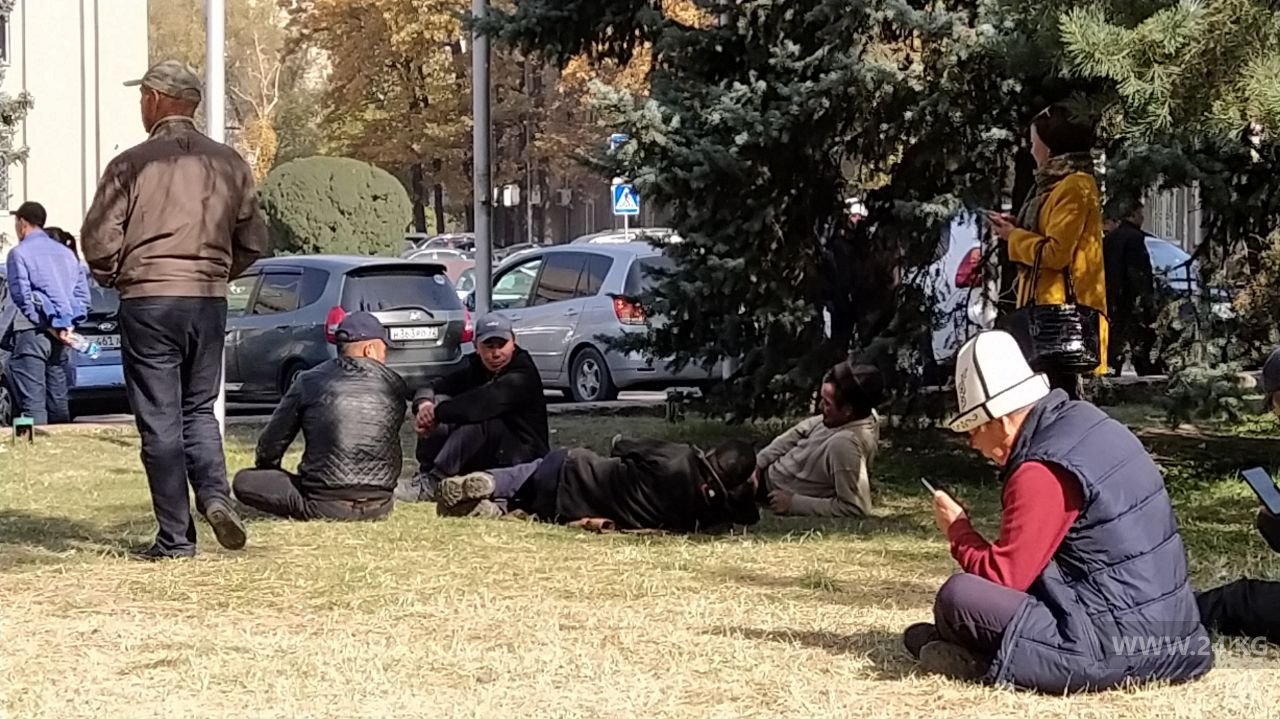 У импровизированной сцены на входе в Дом правительства пусто. Никто не выступает, из колонок играет музыка. Сторонники премьера расположились на газонах. Они внимательно следят за новостями из госрезиденции «Ала-Арча», где завершилось заседание Жогорку Кенеша. Многие, уткнувшись в телефоны, читают ленты новостных агентств. По их словам, они не уйдут, пока не убедятся, что их требования выполнены. Некоторые привели на площадь детей.