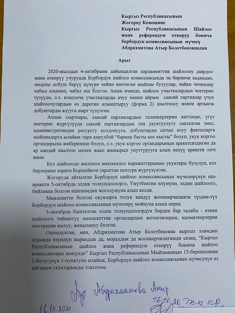 «На прошедших выборах избирательная комиссия стала цензором средств массовой информации, тем самым ограничив конституционные гарантии свободы слова. Именно ЦИК стала корнем утери доверия граждан к выборам и их результату, приведшим к народным волнениям 5 октября, смерти Умутбека. Ответственность за произошедшее в стране полностью лежит на членах Центризбиркома. Мы все знаем, что одним из требований народа в эти дни была люстрация всех должностных лиц, государственных органов, сотрудников и тех, кто имеет отношение к прошедшим выборам и их обновлению. И это в первую очередь касается избирательной комиссии. Поэтому, понимая всю гражданскую и моральную ответственность перед своим народом, я добровольно слагаю свои полномочия члена ЦИК», — заключила она.