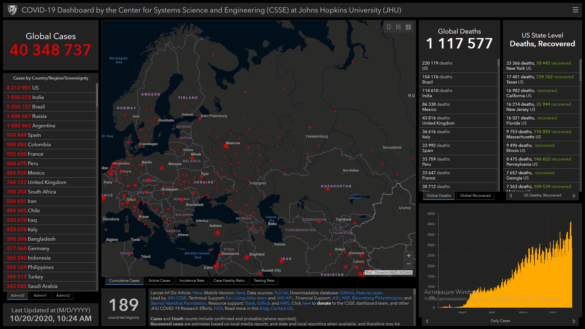 Всего в мире коронавирусом заразились 40 миллионов 348 тысяч 737 человек. Больше всего зараженных в США (8 миллионов 212 тысяч 981), Индии (7 миллионов 550 тысяч 273), Бразилии (5 миллионов 250 тысяч 727), России (1 миллион 406 тысяч 667), Аргентине (1 миллион 2 тысячи 662), Испании (974 тысячи 449), Колумбии (965 тысяч 883), Франции (952,6 тысячи), Перу (868 тысяч 675) и Мексике (854 тысячи 926).
