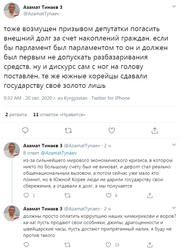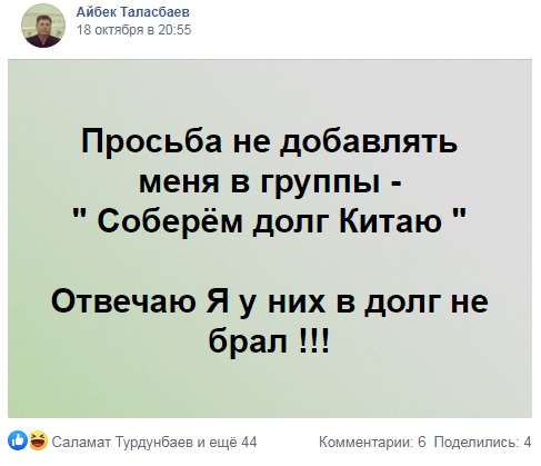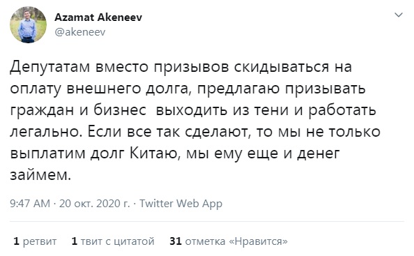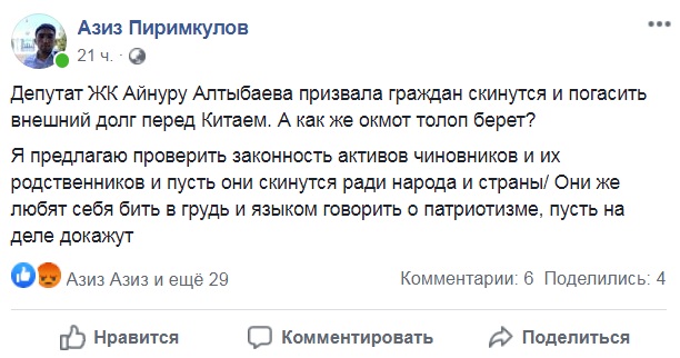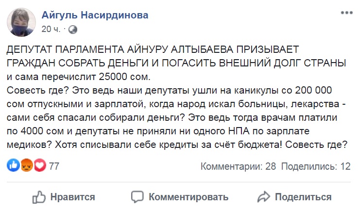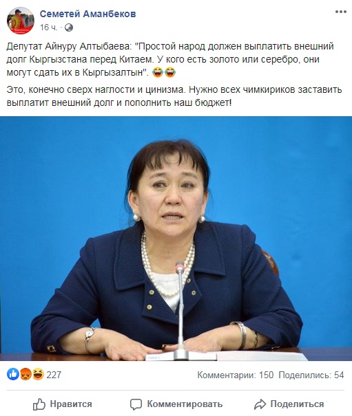 Вчера депутат парламента Айнуру Алтыбаева призвала граждан собрать деньги и погасить внешний долг страны, в частности Китаю.