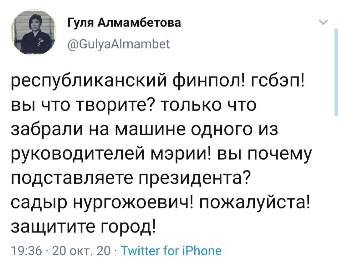 Как сообщила в соцсетях советница мэра Гуля Алмамбетова, чиновника посадили в машину и увезли.