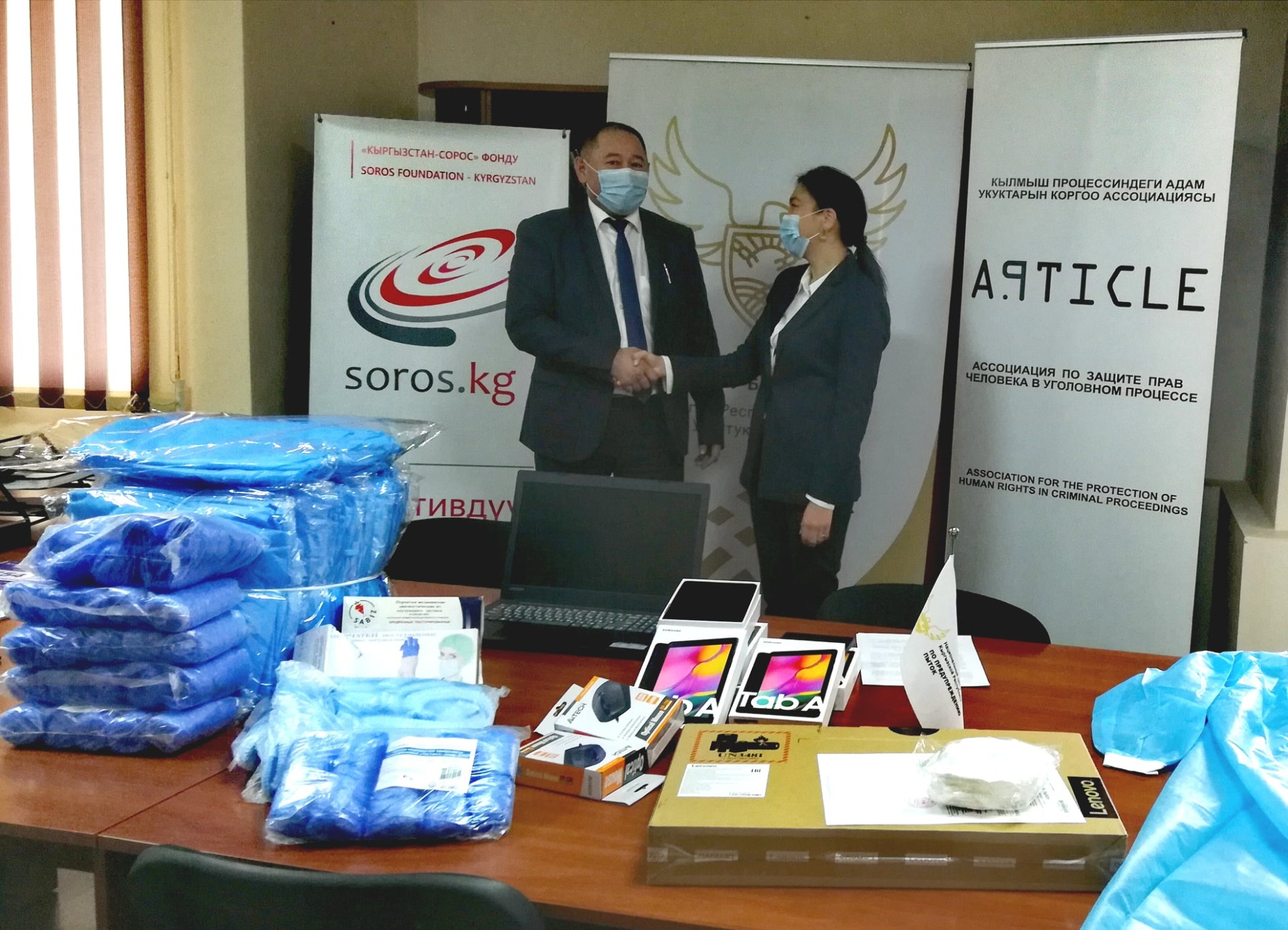 По ее данным, в рамках проекта, реализуемого ОФ «Центр защиты общественных интересов», при поддержке Фонда «Сорос — Кыргызстан» состоялась передача средств индивидуальной защиты (84 одноразовых медицинских халата, 100 респираторных масок, 100 медицинских чепчиков, 300 пар бахил и 100 пар перчаток), двух ноутбуков и шести планшетов.