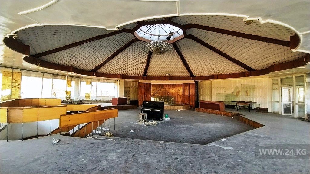 В буклете упоминается и уникальный ресторан, построенный в форме национальной юрты. Сейчас это руины. Первый этаж полностью разбит. Посреди второго — пустого и разграблено этажа стоит чудом уцелевшее, хотя и изрядно потрепанное фортепиано. В коридоре по пути к ресторану на стене осталось датированное ноябрем 2008 года объявление — «4-я Азиатско-Тихоокеанская астрономическая олимпиада». Каких-то 12 лет назад здесь все еще кипела жизнь.