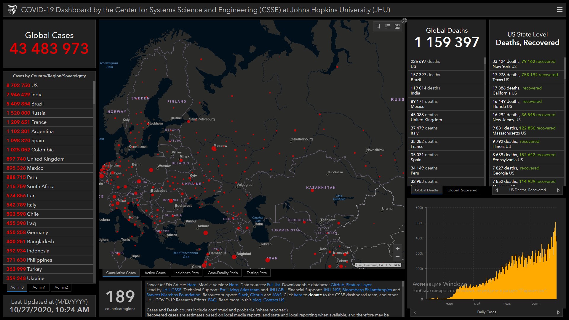 Всего в мире коронавирусом заразились 43 миллиона 483 тысячи 973 человека. Больше всего зараженных в США (8 миллионов 702 тысячи 750), Индии (7 миллионов 946 тысяч 429), Бразилии (5 миллионов 409 тысяч 854), России (1 миллион 520 тысяч 800), Франции (1 миллион 209 тысяч 651), Аргентине (1 миллион 102 тысячи 301), Испании (1 миллион 98 тысяч 320), Колумбии (1 миллион 25 тысяч 52), Великобритании (897 тысяч 740) и Мексике (895 тысяч 326).