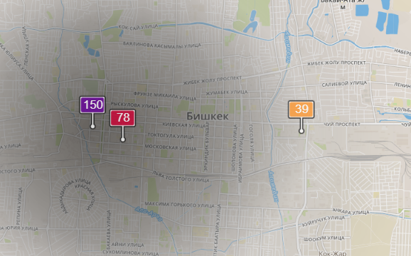 - в районе улиц Бейшеналиевой/Токтогула. Уровень загрязнения превышен в 1,54 раза: PM2.5 среднесуточный — 62 мкг/м³, на момент измерения — 150 мкг/м³;