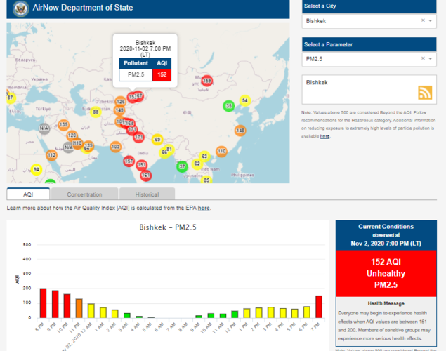 Посольство США в Кыргызстане также установило датчик. Он показывает индекс качества воздуха в режиме онлайн. Информация обновляется ежечасно.