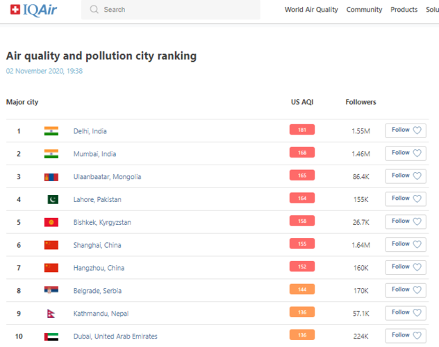 В рейтинге крупнейших городов мира по качеству воздуха World Air Quality на 19.30 Бишкек находится на пятом месте.