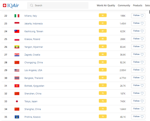 В рейтинге крупнейших городов мира по качеству воздуха World Air Quality на 8.30 Бишкек находится на 31-м месте.