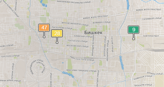 - в районе улиц Бейшеналиевой/Токтогула. Уровень загрязнения превышен в 1,68 раза: PM2.5 среднесуточный — 59 мкг/м³, на момент измерения — 47 мкг/м³;