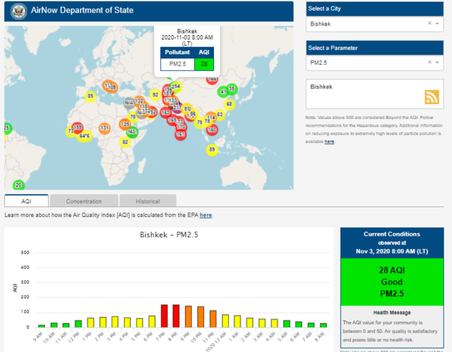 Посольство США в Кыргызстане также установило датчик. Он показывает индекс качества воздуха в режиме онлайн. Информация обновляется ежечасно.