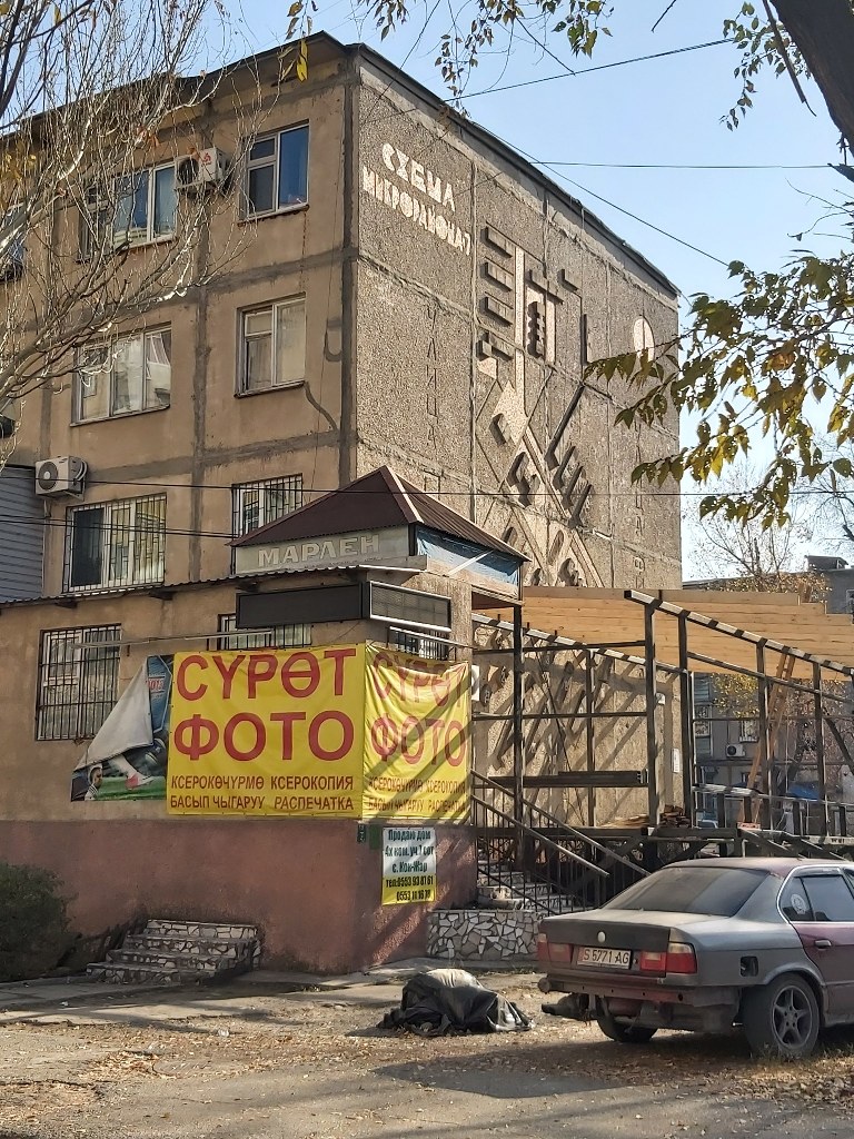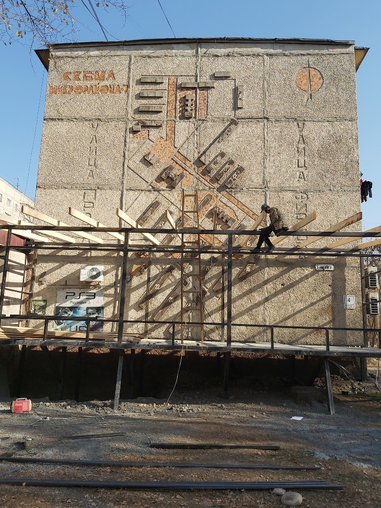 В 7-м микрорайоне Бишкека бизнесмен, строя павильон, загораживает уникальный барельеф, расположенный на торце дома № 4. Об этом в социальных сетях рассказал бишкекчанин Марат Темирбек уулу.