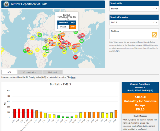 Посольство США в Кыргызстане также установило датчик. Он показывает индекс качества воздуха в режиме онлайн. Информация обновляется ежечасно.