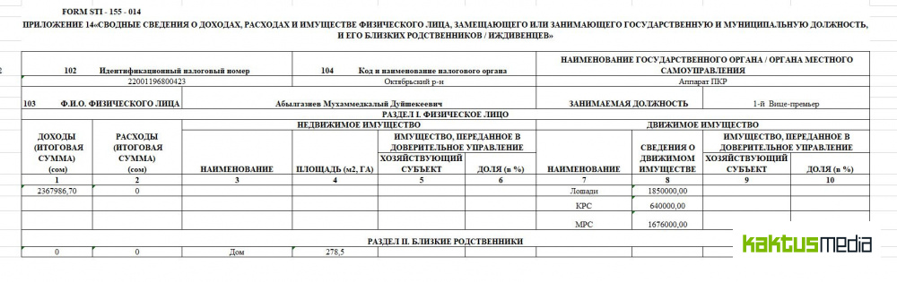 В 2018 году доход премьер-министра составил 826 тысяч 461 сом. В активах были 52 лошади на 2 миллиона 600 тысяч сомов, 22 коровы на 880 тысяч и 524 головы мелкого рогатого скота на 2 миллиона 96 тысяч сомов.