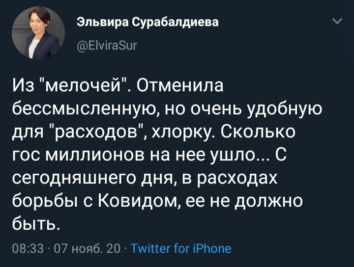«Отменила бессмысленную, но очень удобную для расходов хлорку. Сколько государственных миллионов на нее ушло. С сегодняшнего дня в расходах борьбы с коронавирусом ее не должно быть», — написала она.