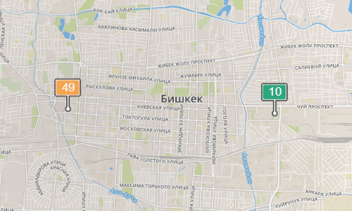 - в районе улиц Бейшеналиевой/Токтогула. Уровень загрязнения превышен в 1,4 раза: PM2.5 среднесуточный — 49 мкг/м³, на момент измерения — 49 мкг/м³;