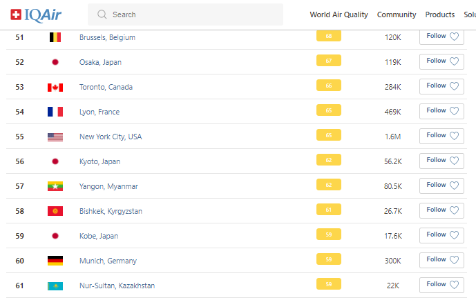 В рейтинге крупнейших городов мира по качеству воздуха World Air Quality на 9.30 Бишкек находится на 58-м месте.