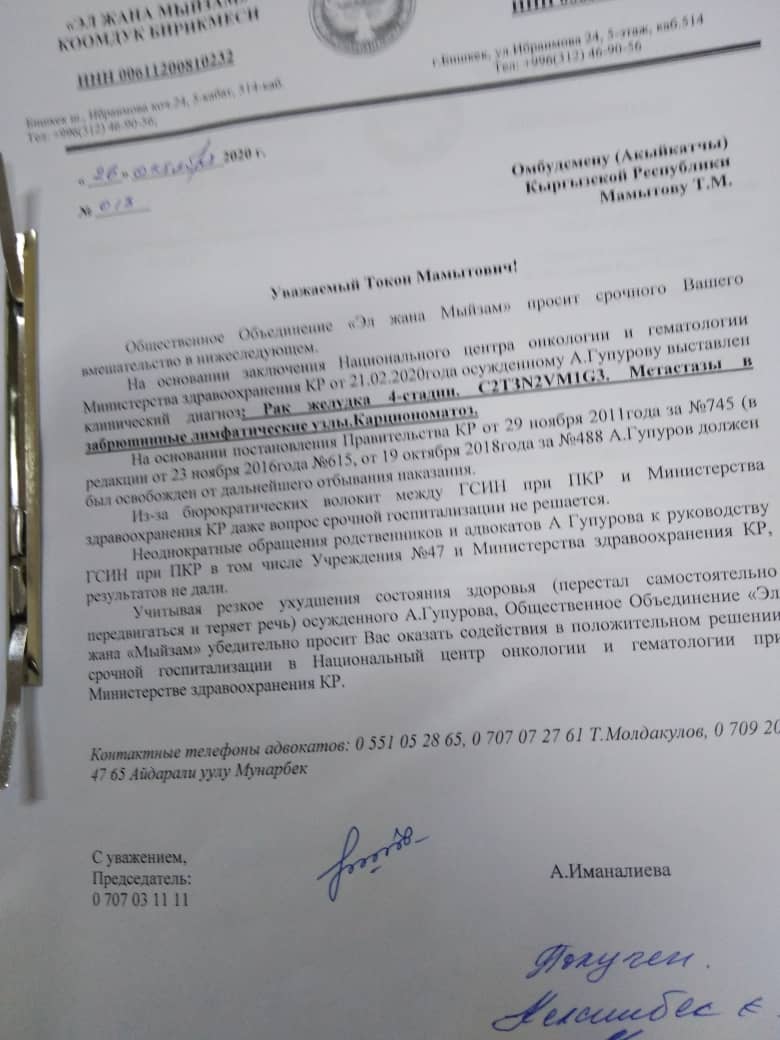 В исправительной колонии № 47 скончался 60-летний Алымжан Гупуров, страдающий от рака четвертой стадии. Об этом 24-kg.com сообщила сестра скончавшегося Мехрибан Гупурова.
