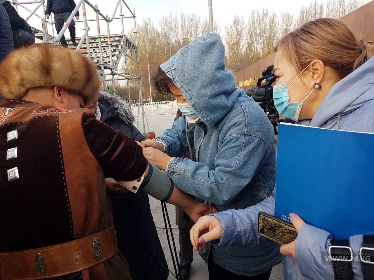 Перед началом церемонии сказания у манасчи Доолота Сыдыкова измерили вес и давление.