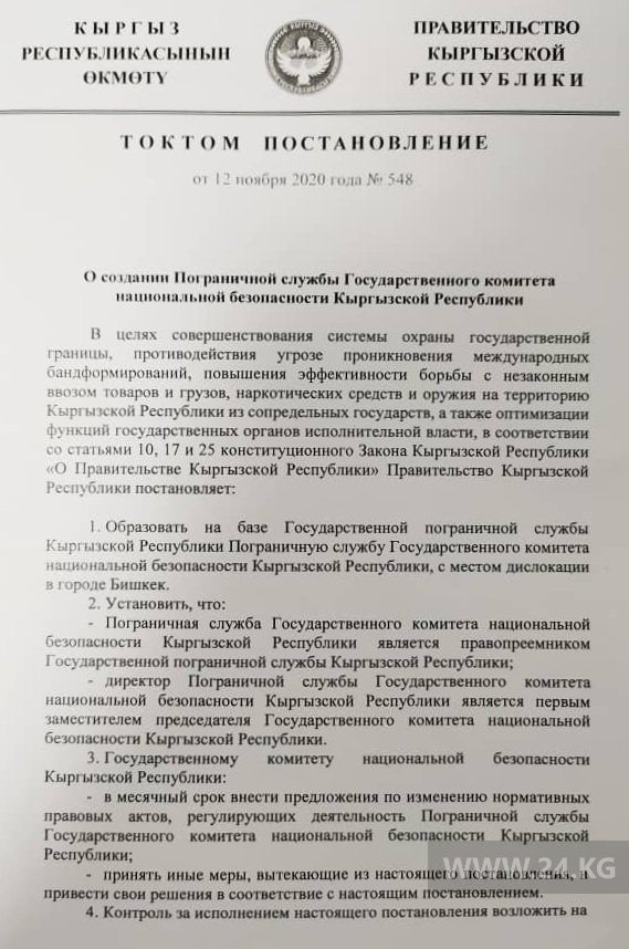 Исполняющий обязанности президента премьер-министр Садыр Жапаров подписал постановление о создании пограничной службы Госкомитета национальной безопасности. Об этом 24-kg.com сообщили собственные источники.