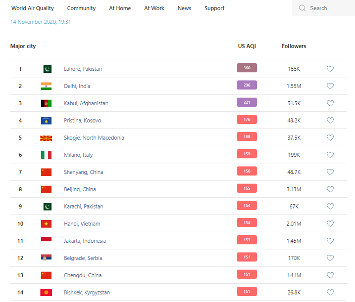 В рейтинге крупнейших городов мира по качеству воздуха World Air Quality на 19.30 Бишкек опустился на 14-е место.