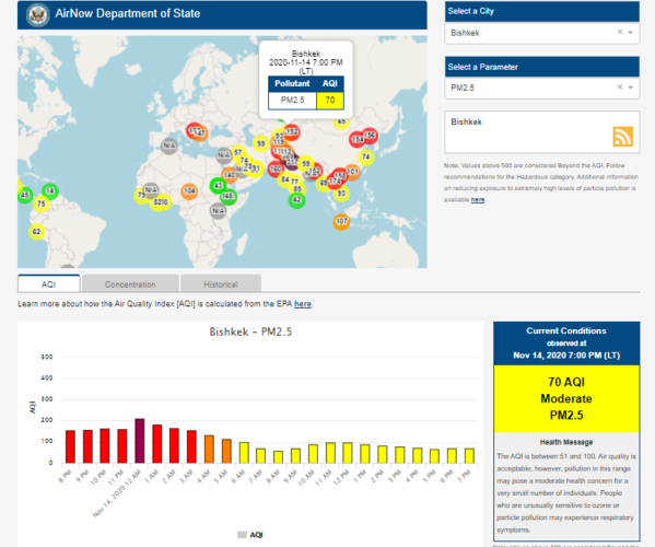 Посольство США в Кыргызстане также установило датчик. Он показывает индекс качества воздуха в режиме онлайн. Информация обновляется ежечасно.
