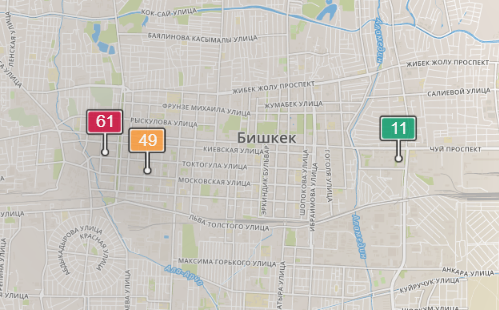 - в районе улиц Бейшеналиевой/Токтогула. Уровень загрязнения превышен в 2,65 раза: PM2.5 среднесуточный — 93 мкг/м³, на момент измерения — 61 мкг/м³;