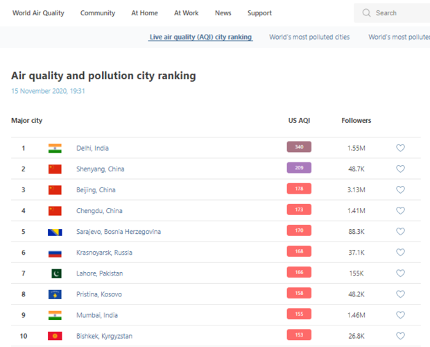 В рейтинге крупнейших городов мира по качеству воздуха World Air Quality на 19.30 Бишкек поднялся на 10-е место.