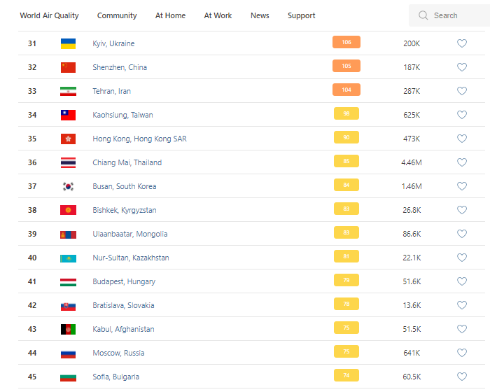 В рейтинге крупнейших городов мира по качеству воздуха World Air Quality на 8.30 Бишкек поднялся на 38-е место.
