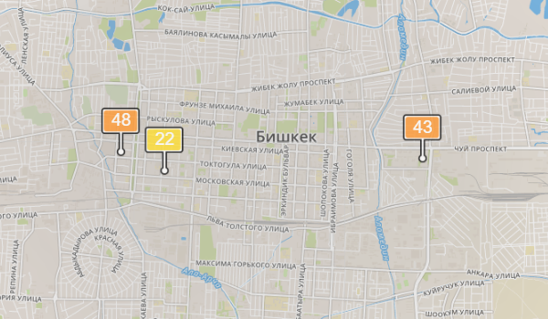 - в районе улиц Бейшеналиевой/Токтогула. Уровень загрязнения превышен в 1,74 раза: PM2.5 среднесуточный — 61 мкг/м³, на момент измерения — 48 мкг/м³;