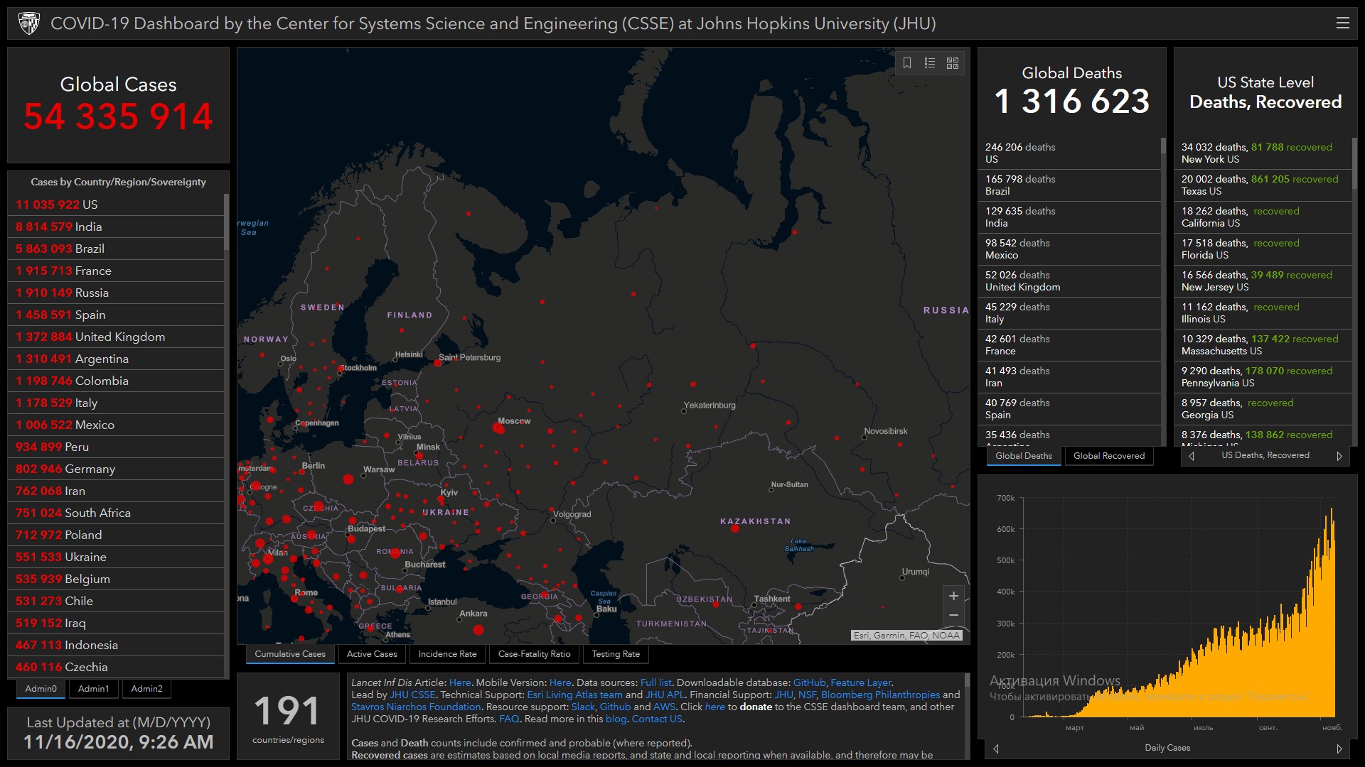 Всего в мире коронавирусом заразились 54 миллиона 335 тысяч 914 человек. Больше всего зараженных в США (11 миллионов 35 тысяч 922), Индии (8 миллионов 814 тысяч 579), Бразилии (5 миллионов 863 тысячи 93), Франции (1 миллион 915 тысяч 713), России (1 миллион 910 тысяч 149), Испании (1 миллион 458 тысяч 591), Великобритании (1 миллион 372 тысячи 884), Аргентине (1 миллион 310 тысяч 491), Колумбии (1 миллион 198 тысяч 746) и Италии (1 миллион 178 тысяч 529).