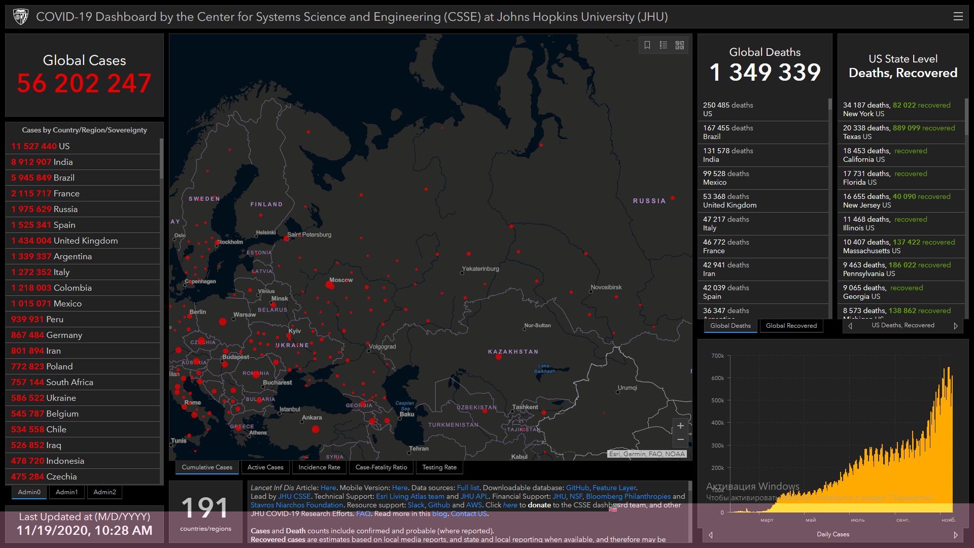 Всего в мире коронавирусом заразились 56 миллионов 202 тысячи 247 человек. Больше всего зараженных в США (11 миллионов 527 тысяч 440), Индии (8 миллионов 912 тысяч 907), Бразилии (5 миллионов 945 тысяч 849), Франции (2 миллиона 115 тысяч 717), России (1 миллион 975 тысяч 629), Испании (1 миллион 525 тысяч 341), Великобритании (1 миллион 434 тысячи 4), Аргентине (1 миллион 339 тысяч 337), Италии (1 миллион 272 тысячи 352) и Колумбии (1 миллион 218 тысяч 3).