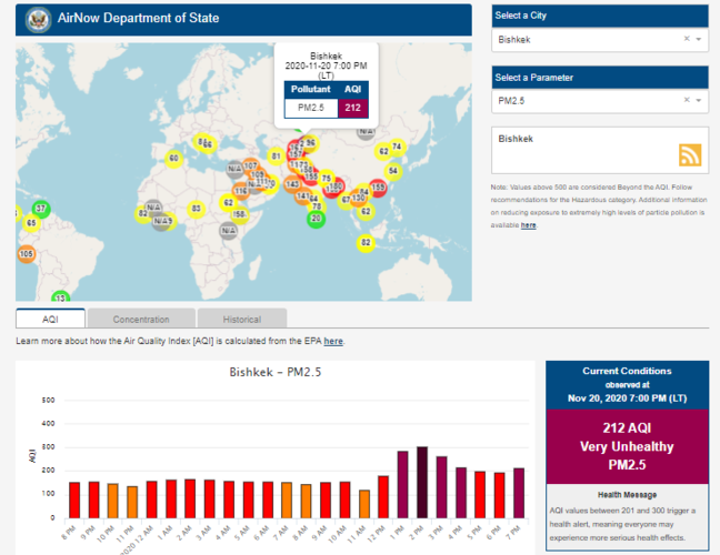 Посольство США в Кыргызстане также установило датчик. Он показывает индекс качества воздуха в режиме онлайн. Информация обновляется ежечасно.