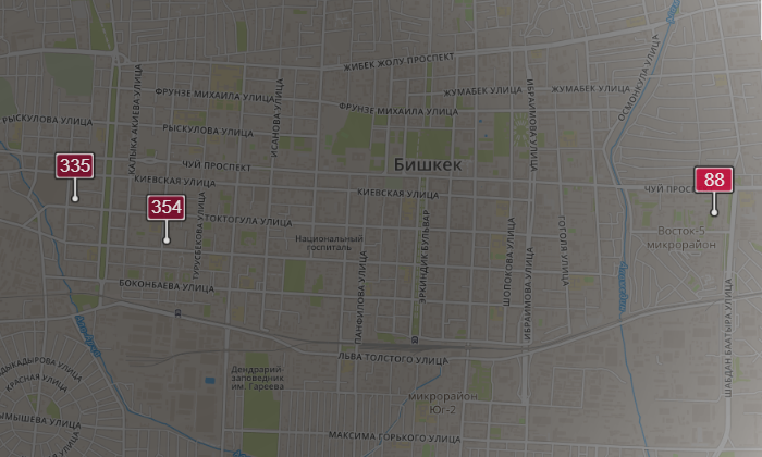 - в районе улиц Бейшеналиевой/Токтогула. Уровень загрязнения превышен в 6,97 раза: PM2.5 среднесуточный — 244 мкг/м³, на момент измерения — 355 мкг/м³;