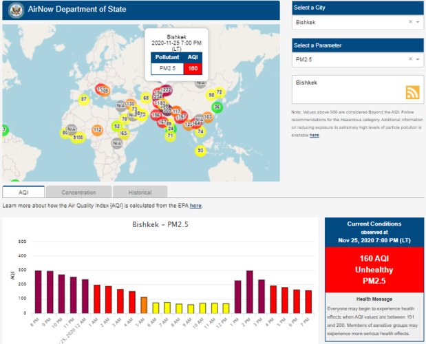 Посольство США в Кыргызстане также установило датчик. Он показывает индекс качества воздуха в режиме онлайн. Информация обновляется ежечасно.