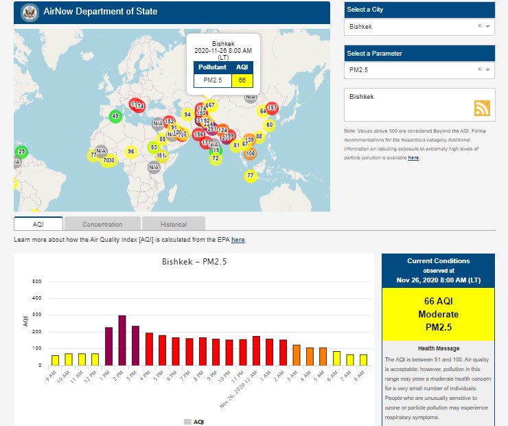 Посольство США в Кыргызстане также установило датчик. Он показывает индекс качества воздуха в режиме онлайн. Информация обновляется ежечасно.