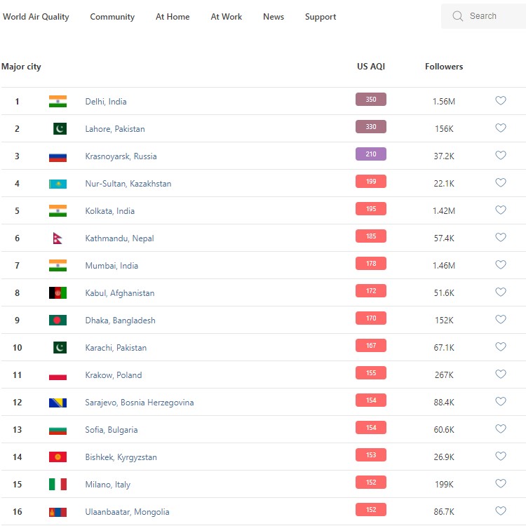 В рейтинге крупнейших городов мира по качеству воздуха World Air Quality на 8.30 Бишкек опустился на 12-е место.