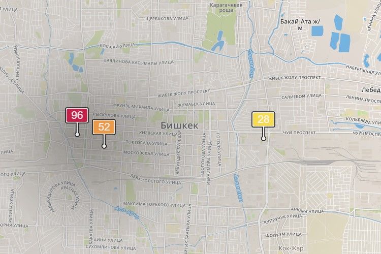 - в районе улиц Бейшеналиевой/Токтогула. Уровень загрязнения превышен в 5,63 раза: PM2.5 среднесуточный — 197 мкг/м³, на момент измерения — 96 мкг/м³;