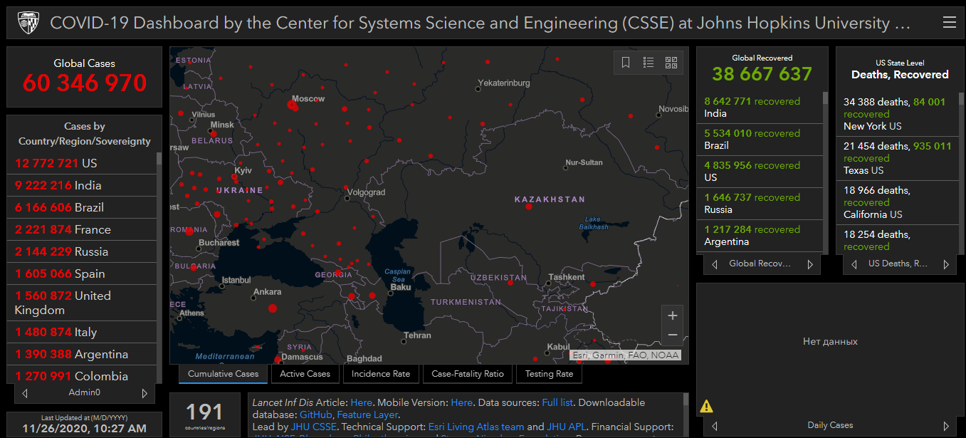 Всего в мире коронавирусом заразились 60 миллионов 346 тысяч 970 человек. Больше всего зараженных в США (12 миллионов 772 тысячи 721), Индии (9 миллионов 222 тысячи 216), Бразилии (6 миллионов 166 тысяч 606), Франции (2 миллиона 221 тысяча 774), России (2 миллиона 144 тысячи 229), Испании (1 миллион 605 тысяч 606), Великобритании (1 миллион 560 тысяч 872), Италии (1 миллион 480 тысяч 874), Аргентине (1 миллион 390 тысяч 388) и Колумбии (1 миллион 270 тысяч 991).
