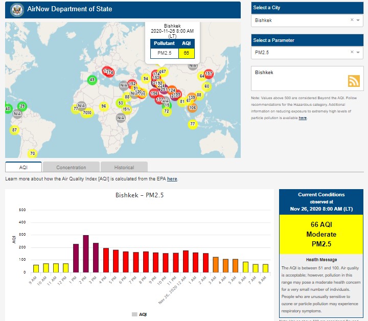 Посольство США в Кыргызстане также установило датчик. Он показывает индекс качества воздуха в режиме онлайн. Информация обновляется ежечасно.