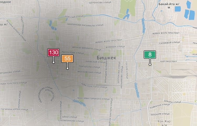 - в районе улиц Бейшеналиевой/Токтогула. Уровень загрязнения превышен в 3,23 раза: PM2.5 среднесуточный — 113 мкг/м³, на момент измерения — 130 мкг/м³;