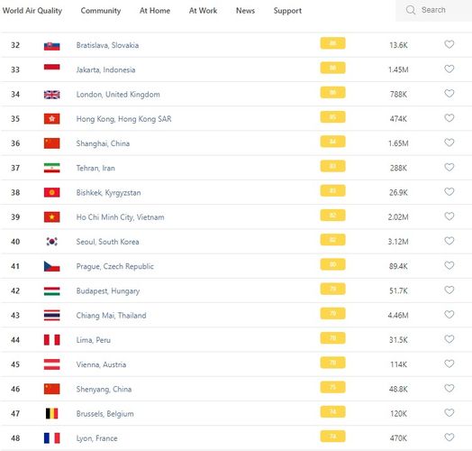 В рейтинге крупнейших городов мира по качеству воздуха World Air Quality на 8.30 Бишкек находится на 38-м месте.