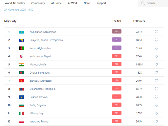 В рейтинге крупнейших городов мира по качеству воздуха World Air Quality на 19.30 Бишкек поднялся на 7-е место.