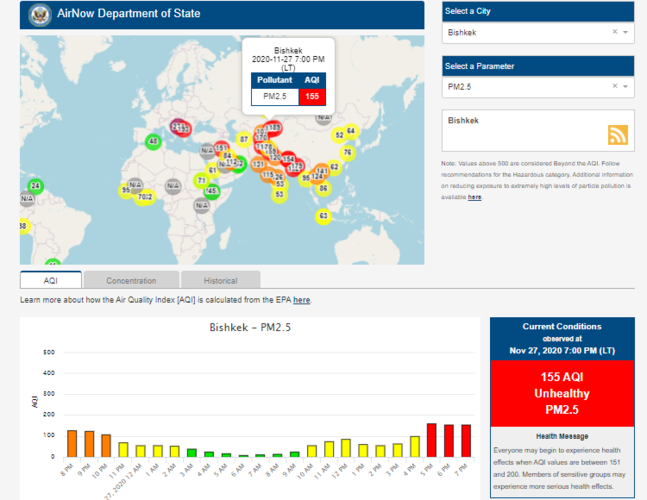 Посольство США в Кыргызстане также установило датчик. Он показывает индекс качества воздуха в режиме онлайн. Информация обновляется ежечасно.
